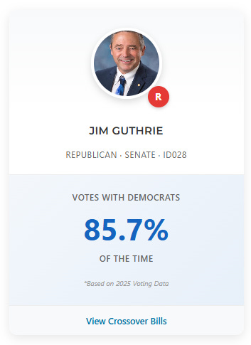 Jim Guthrie is the worst Republican in the Idaho Senate when it comes to voting with Democrats. Our research shows he voted with Democrats 85.7% of the time in 2025. That’s awful