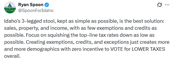 This approach is the exact opposite of what we should be doing in Idaho. If we want to live within our means, we need a leaner, simpler tax structure, one that limits the number of ways government can reach into your wallet. A single, limited revenue source forces discipline. The three-legged stool eliminates it.
